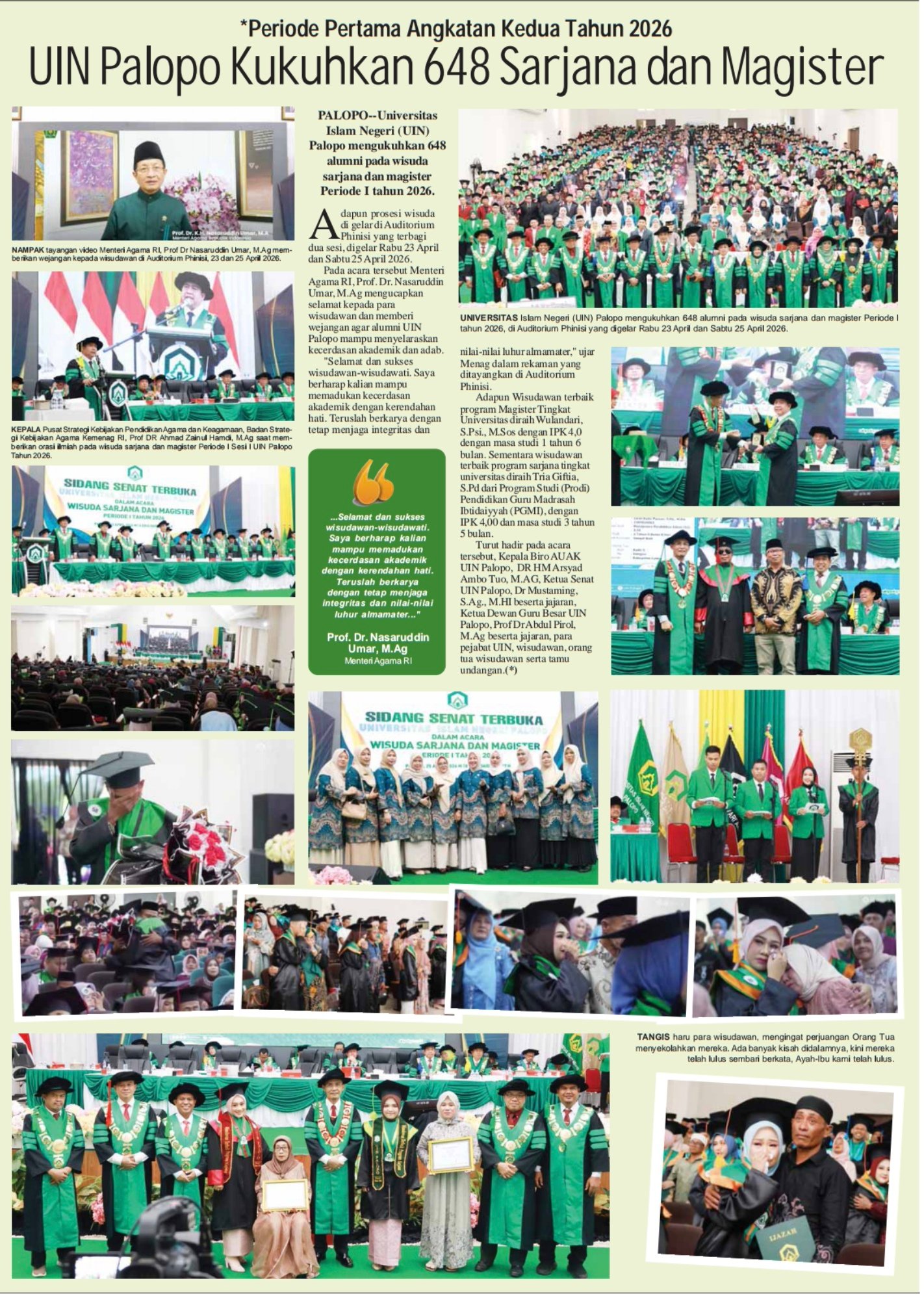 “Selamat dan sukses wisudawan-wisudawati. Saya berharap kalian mampu memadukan kecerdasan akademik dengan kerendahan hati. Teruslah berkarya dengan tetap menjaga integritas dan nilai-nilai luhur almamater,” ujar Menag dalam rekaman yang ditayangkan di Auditorium Phinisi.