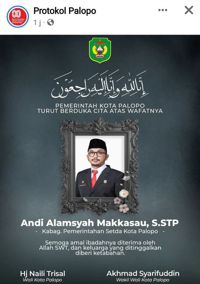 Meninggalnya Kabag Pemerintahan terkonfirmasi pada akun facebook Protokol Palopo, Kamis malam.