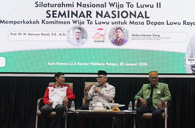 KATARAKJAT.COM,PALOPO–Usai acara Silatnas WTL II di Aula Ratona Balai Kota Palopo, dilanjutkan dengan seminar nasional yang menghadirkan dua narasumber kompeten, yakni Prof. Dr. H. Mansyur Ramly dan Sekretaris Jenderal Forkonas Percepatan Pembentukan DOB Abdurrahman Sang, sementara jalannya seminar dipandu moderator Baharuddin Solongi.